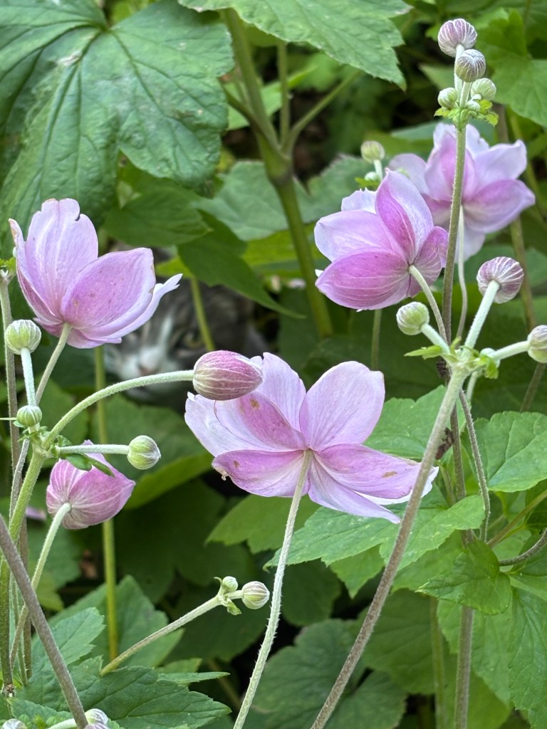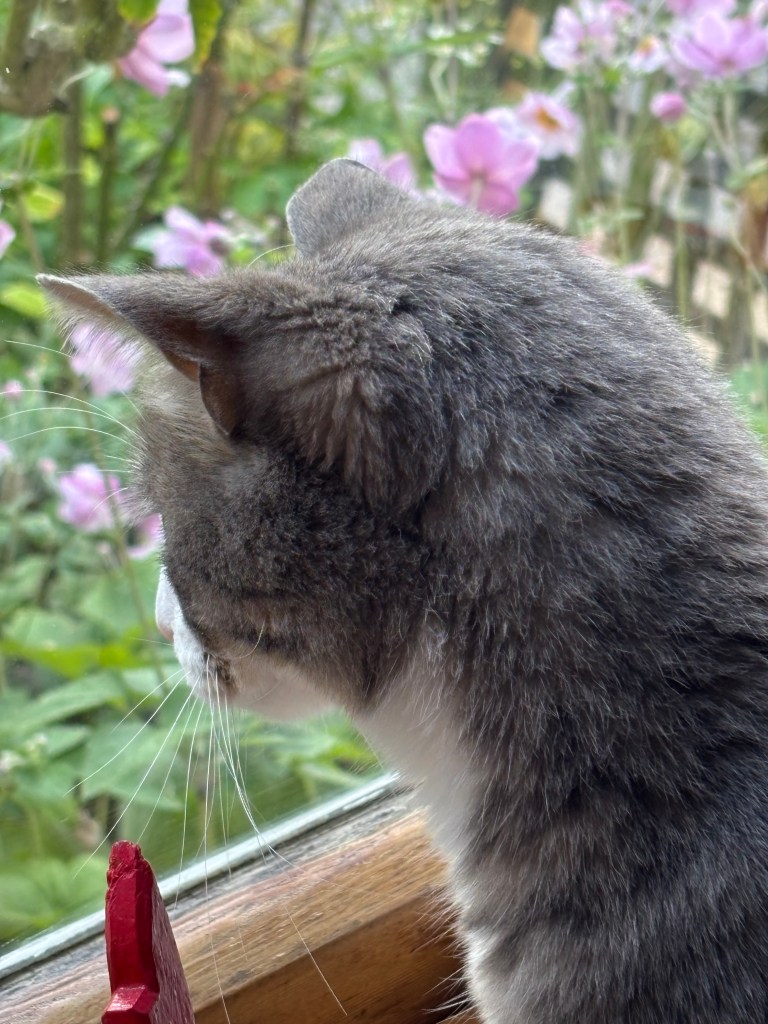 Meanwhile, Felix was riveted by the sight of a flock of waxeyes which descended on the Japanese Anemones and roses outside the window. Next minute, he was out getting amongst it – but the birds were long gone by then.