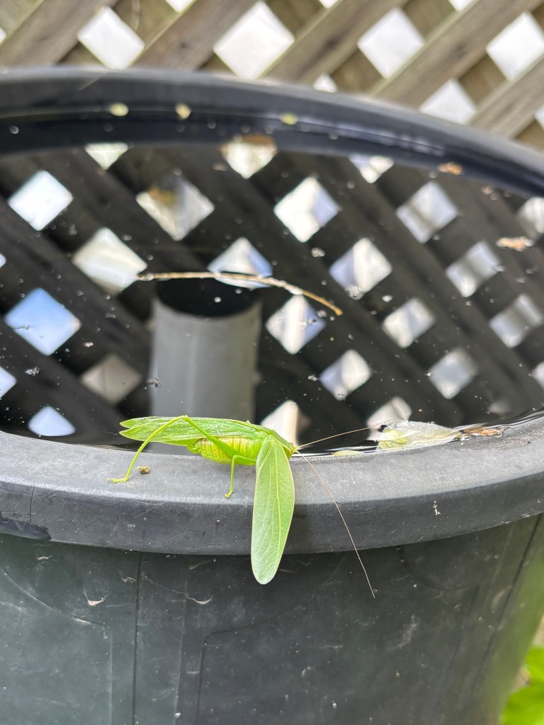 What I thought was a leaf floating on the water in a bucket turned out to be a cricket. It was flat and limp and I thought it had drowned. But it went from 2D to 3D after I rescued it. Two hours or so later it had gone – had it hopped away or had a blackbird got it?