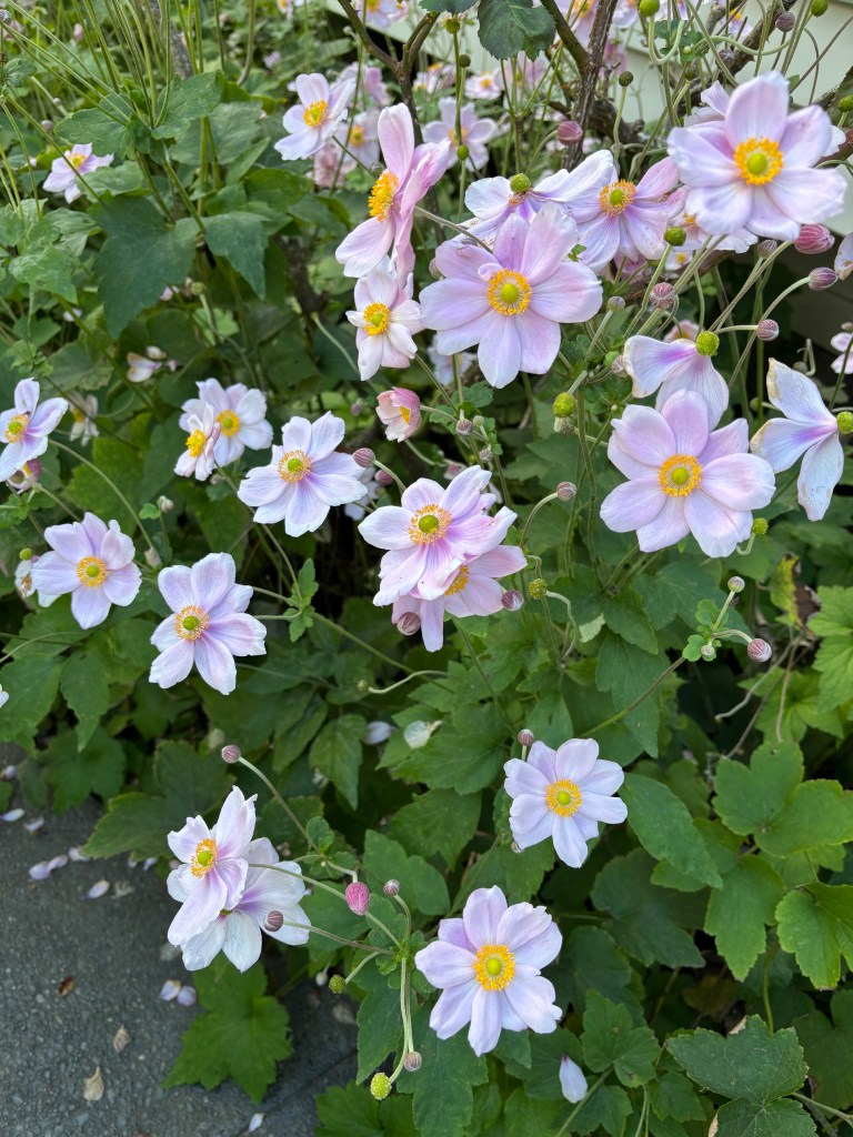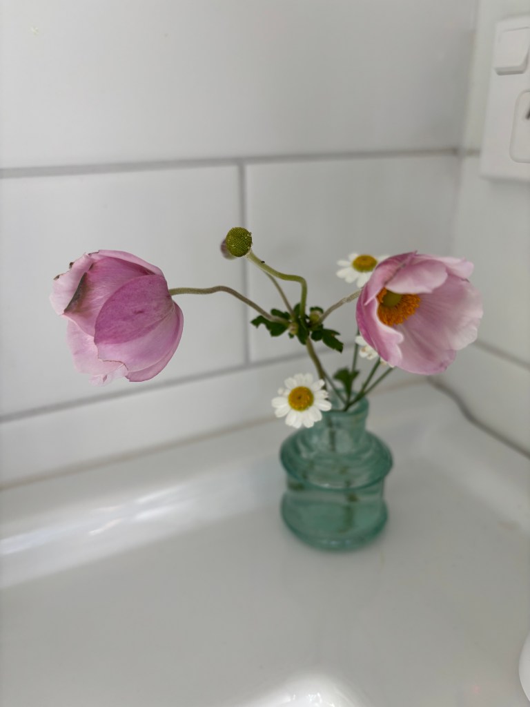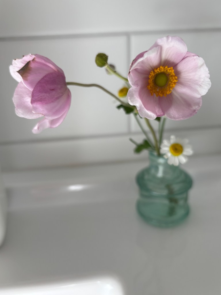 When I close the curtains on dark, the Japanese anemones outside have already closed up for the night. I’m fascinated to see that the anemones inside in a vase do the same.