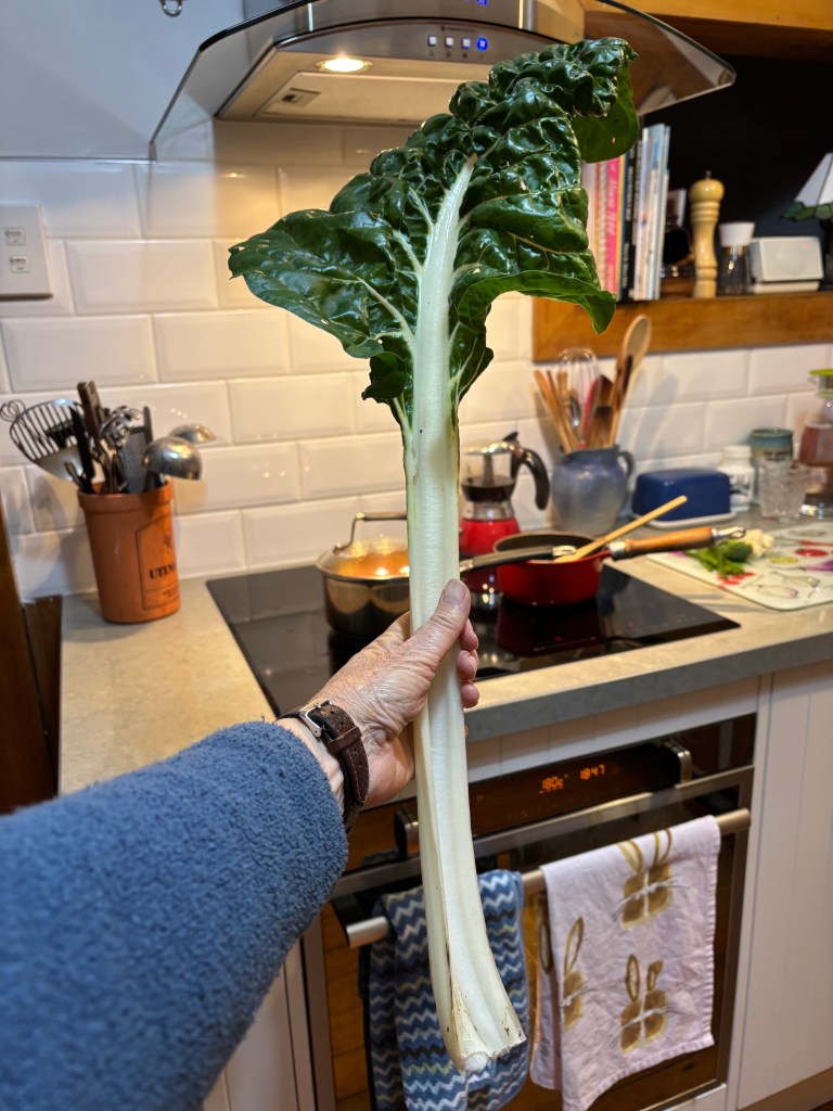 Later, I went out to the garden for some silver beet and picked this leaf. I had to hold my arm at full stretch to get it in the photo.