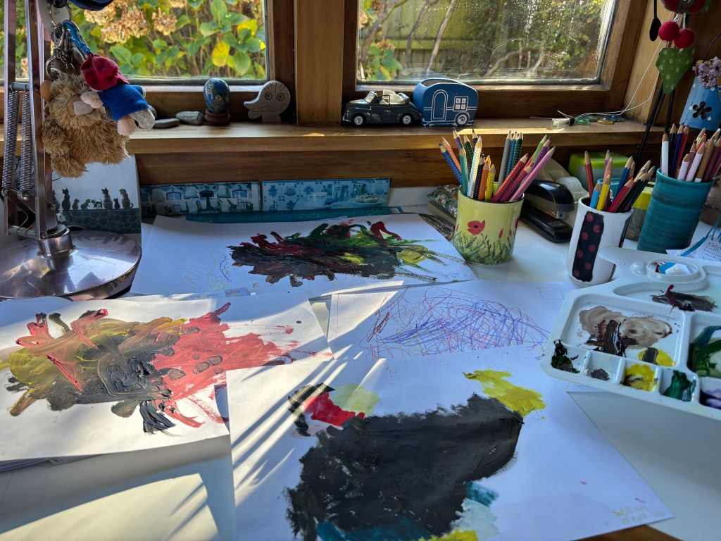 This morning I have the little boys’ artwork, spread out to dry, to remember them by. I will add these pieces to the archive of children’s artwork I have kept.