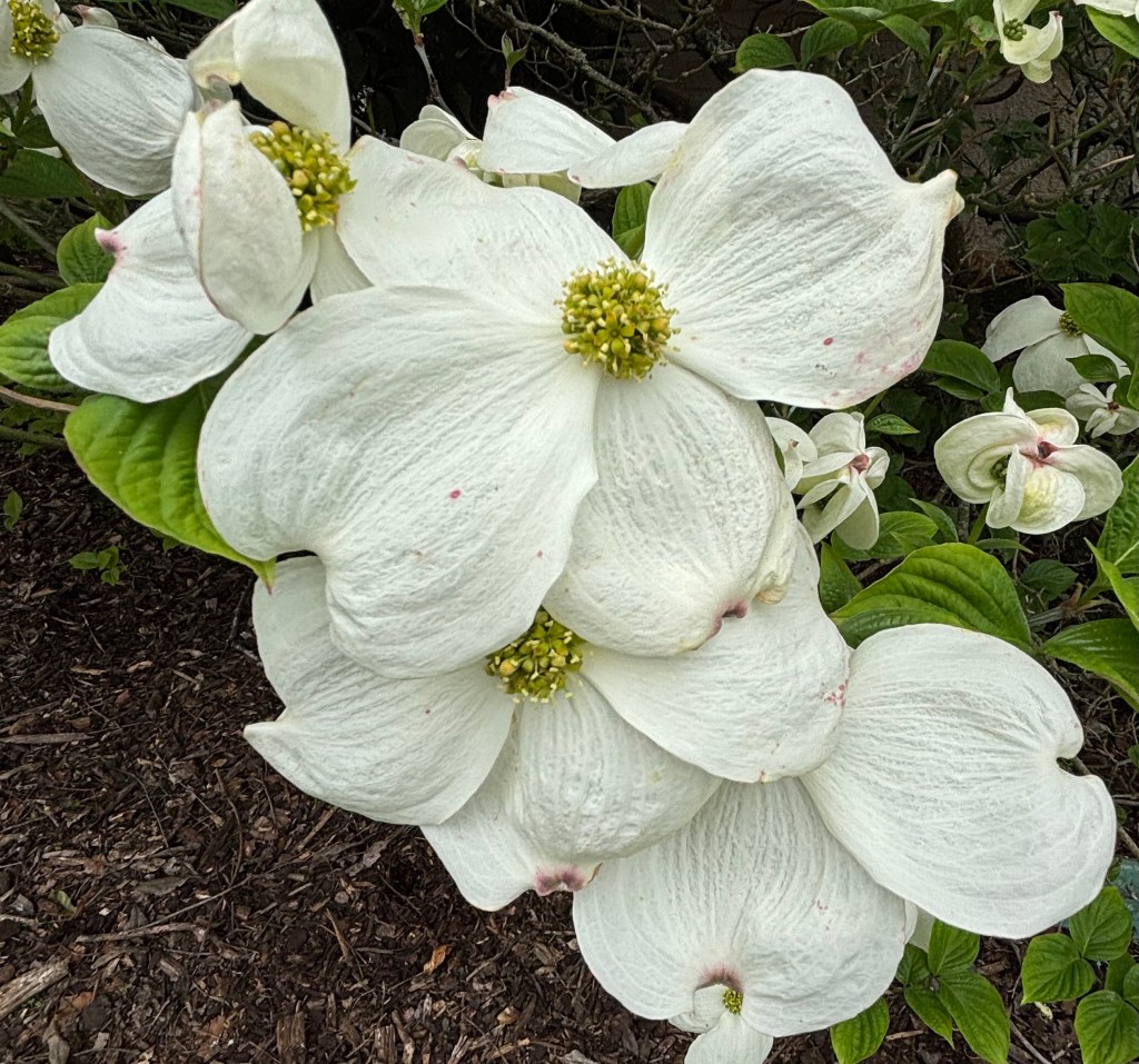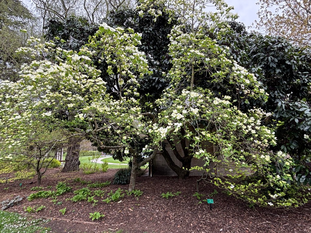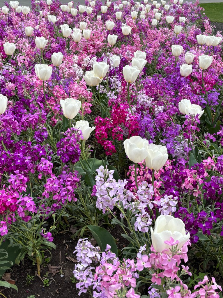 Aiming to work off a lunch out, return my books and get some exercise, I parked on the edge of the Botanic Gardens and walked through to the library. I took paths at random and deviations often when my eye was caught by something such as this spreading dogwood tree with its wide flat petals, and a sea of stock and tulips.