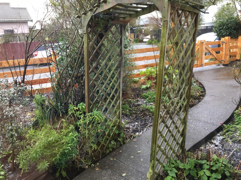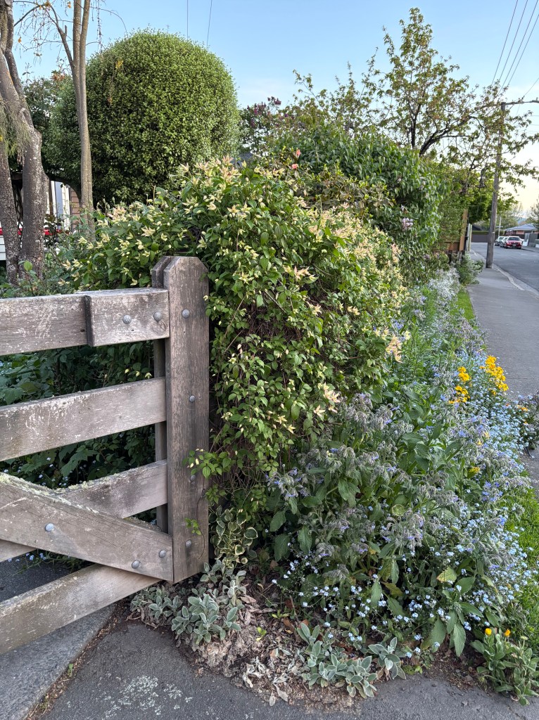 My ‘new’ macrocarpa fence and gates were installed in June 2017 and feature at the top of my blog. Today, the fence is barely visible and the timber has silvered with time. The clematis at the gate is beginning to flower.