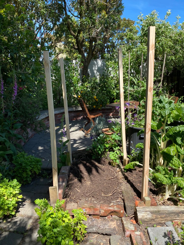 My attempt to construct a bean frame was less than adequate. It looked unlikely to withstand the strong winds which brought down the beans on flimsy bamboo stakes last year.
